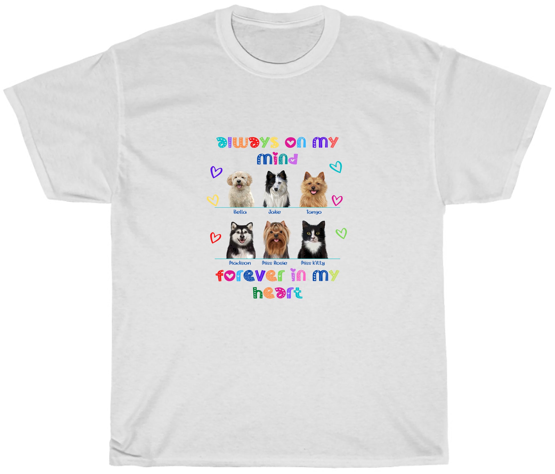 Personalized Always on My Mind Dog Cat Pets Memorial T-shirt 1 to 6 Pets