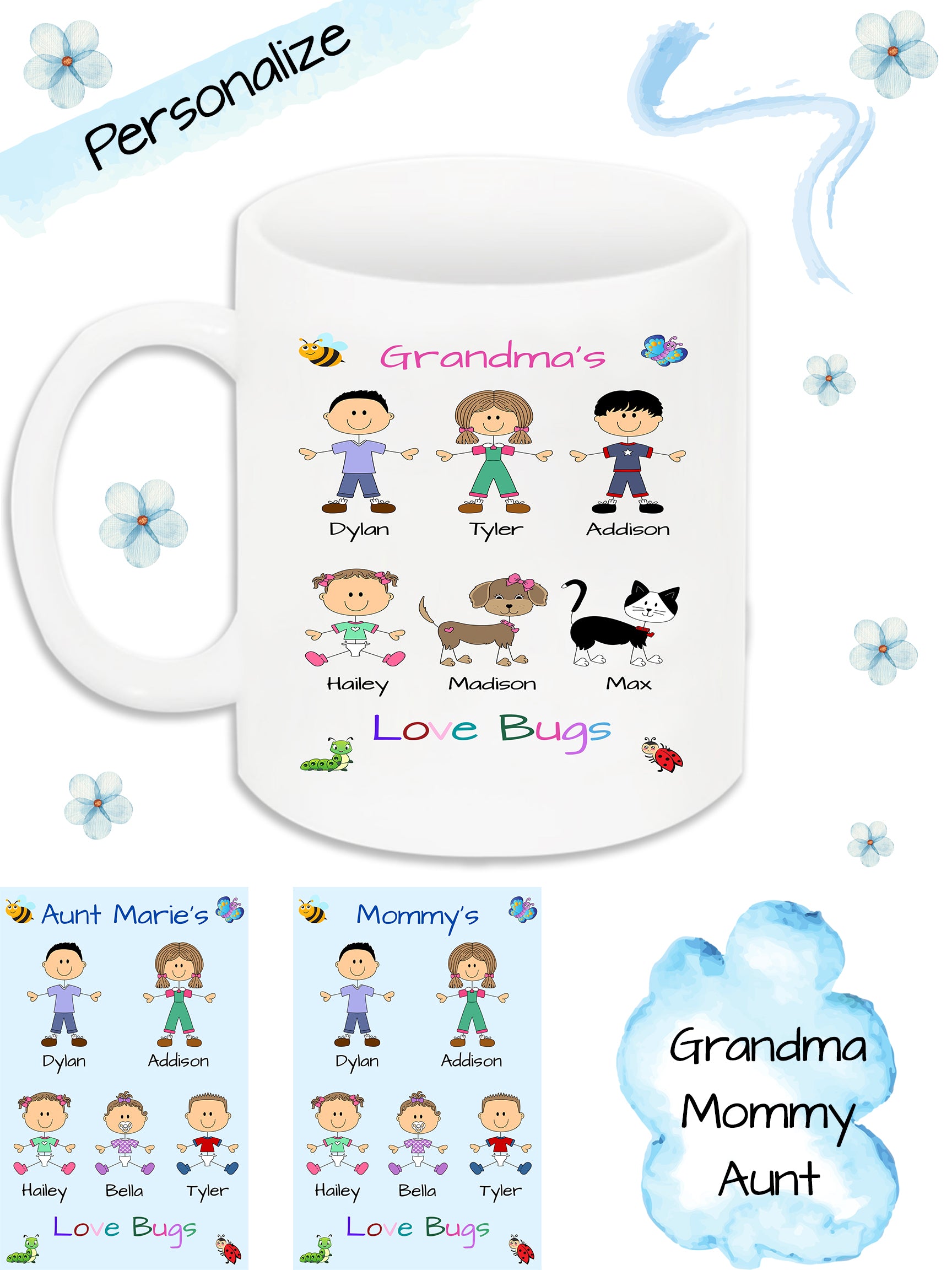 Personalized Dog Cat Pets Grandma, Aunt, Mom, Wife or Sister's Love Bugs 11 OZ Coffee Mug
