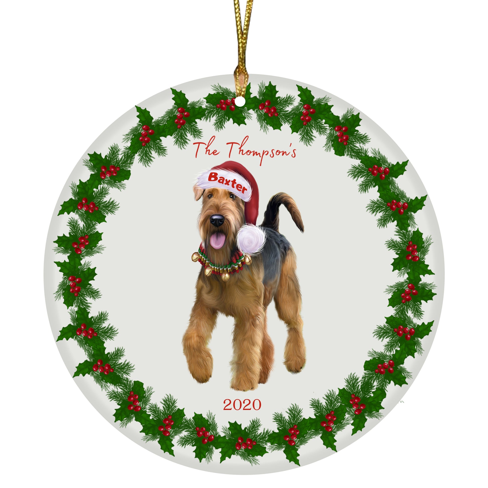 Personalized Holly Berry Trimming Airedale Terrier Dog Ceramic Round Flat Christmas Tree Ornament RFPOR48192