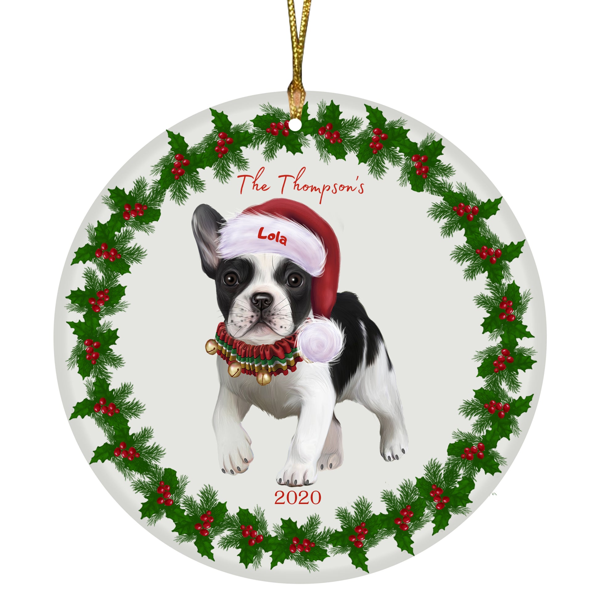 Personalized Holly Berry Trimming French Bulldog Ceramic Round Flat Christmas Tree Ornament RFPOR48286