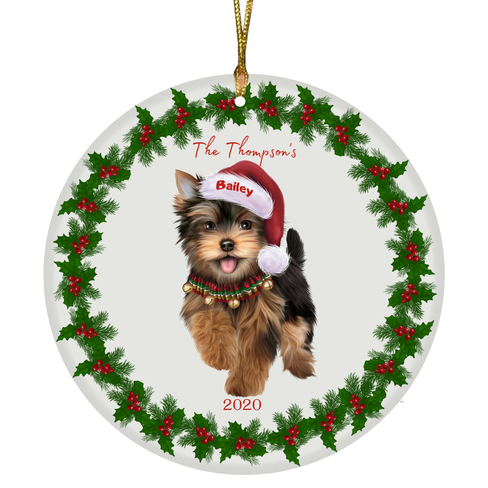 Personalized Holly Berry Trimming Yorkshire Terrier Dog Ceramic Round Flat Christmas Tree Ornament RFPOR48387