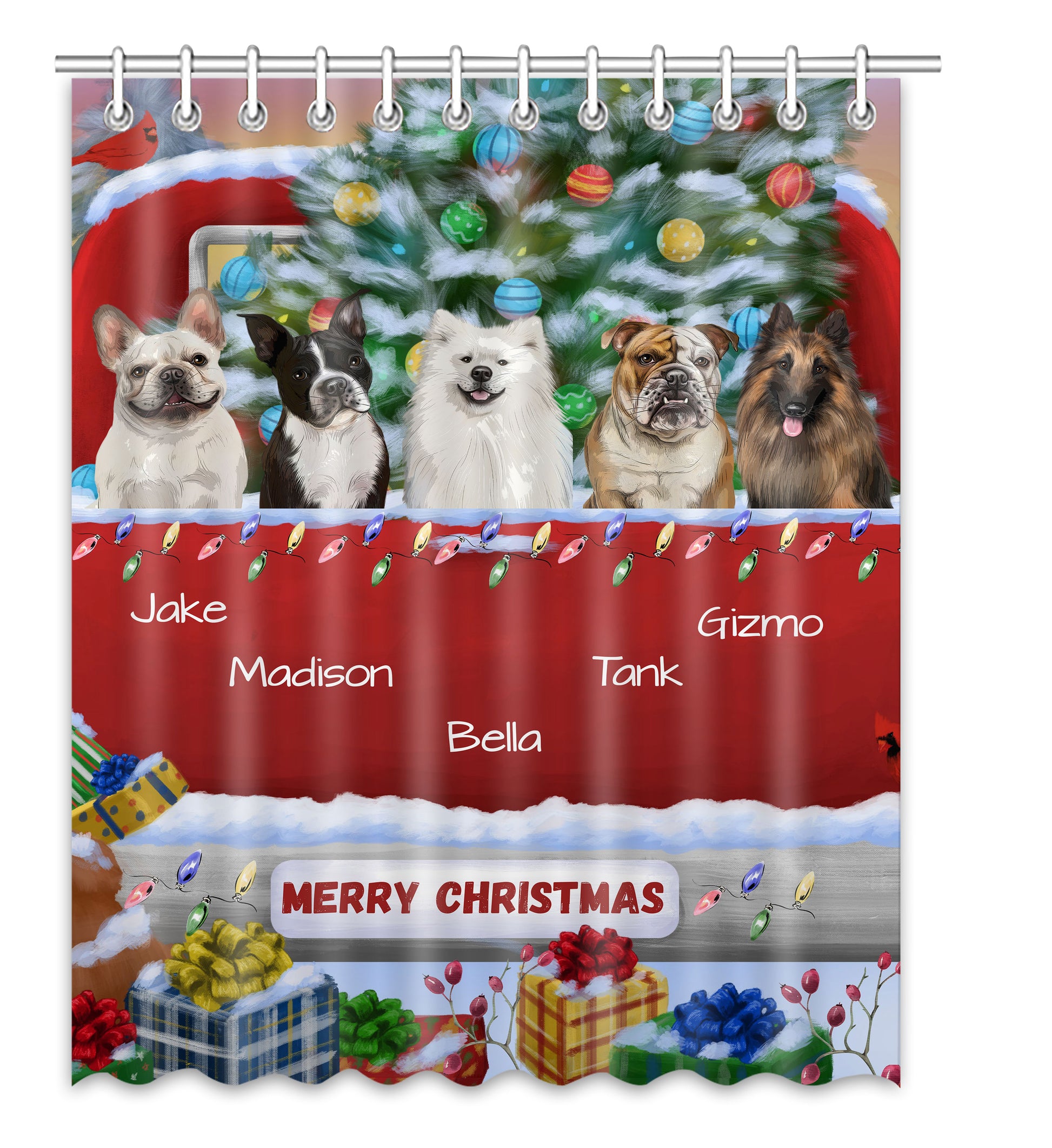 Personalized Merry Christmas Red Truck 1 Dog Cat Pets Shower Curtain 1-5 Pets